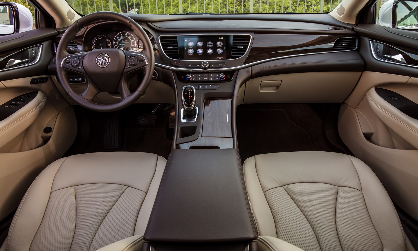 The interior is just as stylized as the exterior. It features a dramatic “floating” center console that positions the electronic shifter closer to the driver while creating storage space below. Buick also splurged for high-quality materials, including aluminum sill plates, wood trim, and soft-touch material at most touch points. French stitching on areas like the seats and instrument panel classes things up even further.
